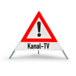 Warnpyramide Gefahrstelle VZ 101 mit dem Aufdruck Kanal-TV mit Dreibeinstativ zur temporären Absicherung der Gefahrenstellen.
