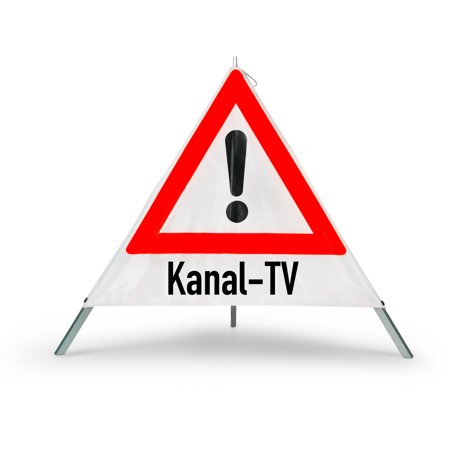 Warnpyramide Gefahrstelle VZ 101 mit dem Aufdruck Kanal-TV mit Dreibeinstativ zur temporären Absicherung der Gefahrenstellen.
