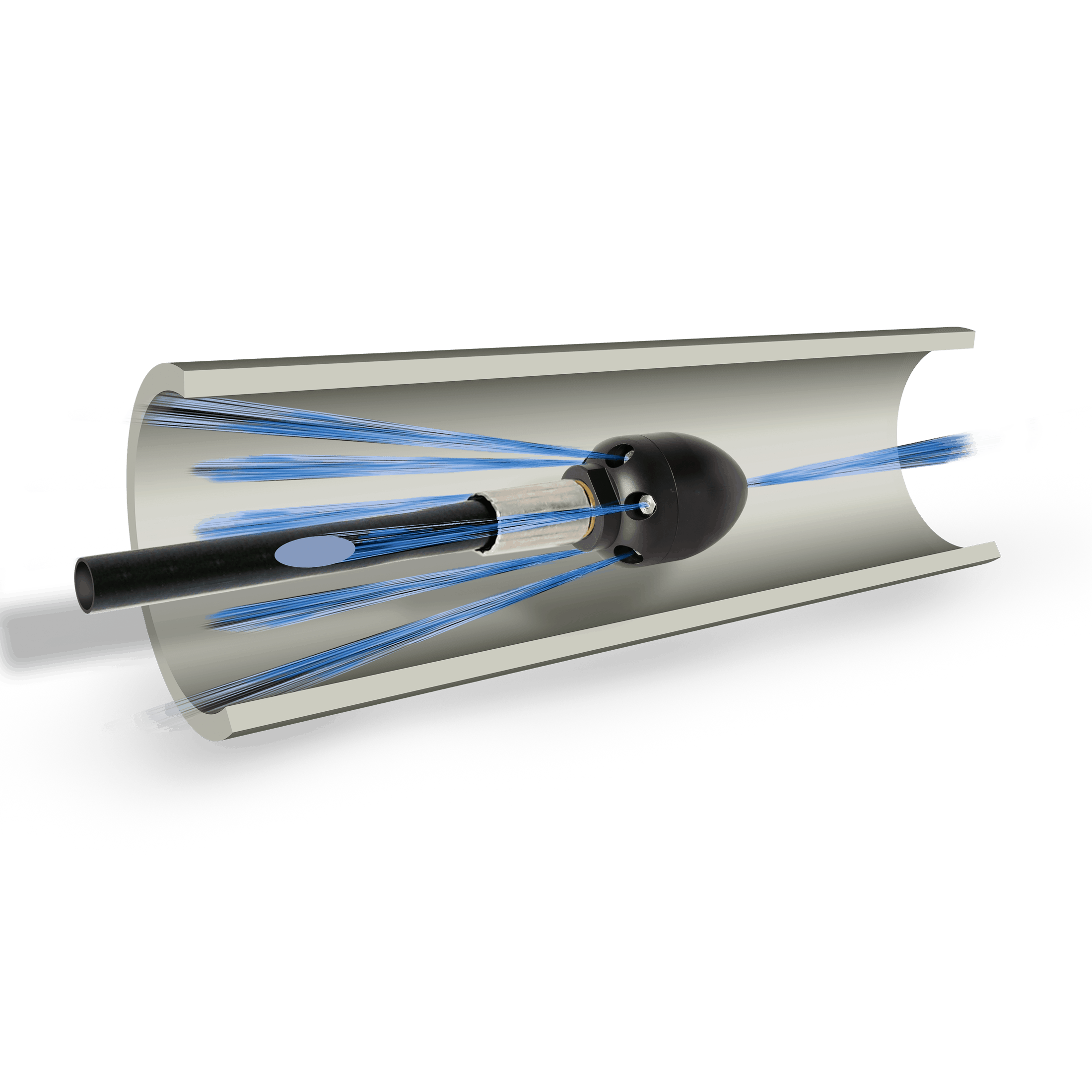 Granat-Düsen sind auf Grund ihrer sehr guten Zug- und Reinigungsleistung universell einsetzbar. Besonders bei großen Rohr- und Haltungslängen zeichnet sie sich durch ihre hohe Zugleistung aus. Die 6 Schubdüsen mit flachem Strahlwinkel bewirken eine hohe Zug- und Abschwemmleistung bei guter Reinigung, auch bei weniger zur Verfügung stehender Wassermenge. Mit dem wahlweise montierbaren Vorstrahleinsatz können außerdem kleine Hindernisse und leichte Verstopfungen beseitigt werden.