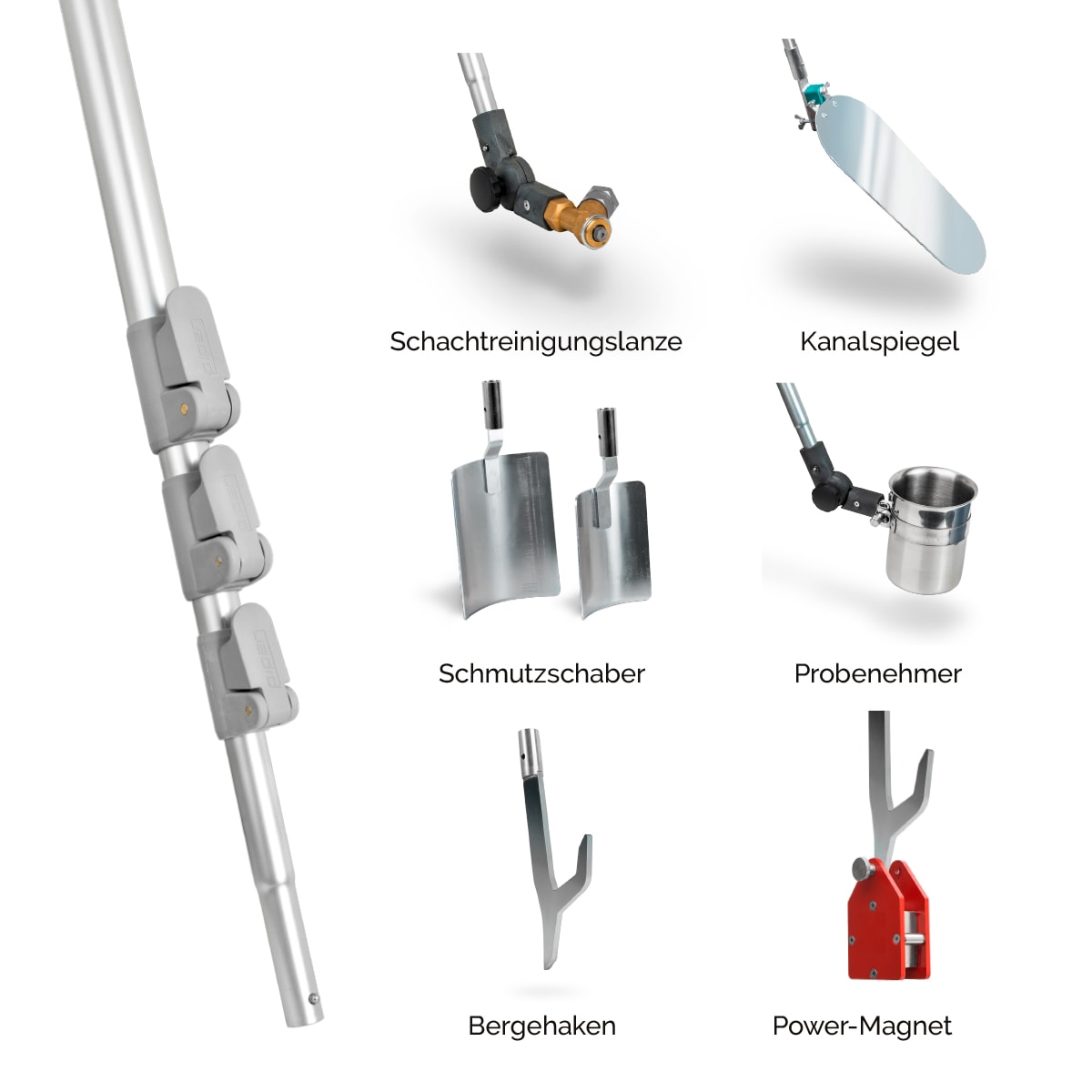 Mit der bis auf 6 m verlängerbaren Teleskopstange und der EX-geschützten Stablampe erreichen Sie jeden zu untersuchenden Winkel.