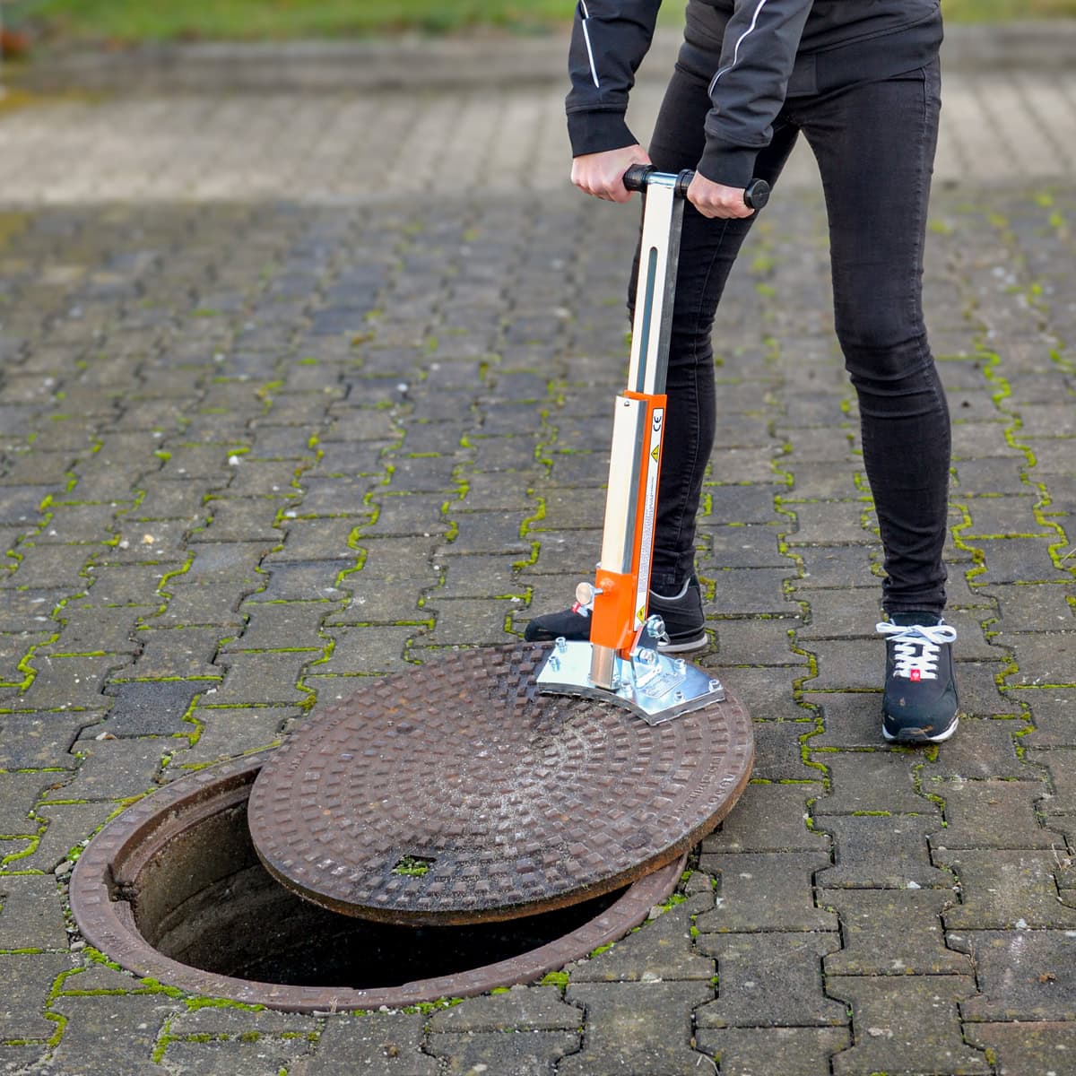 Der Deckelheber kann auch alle anderen gängigen Abdeckungen oder Gitter aus Gusseisen und Eisenwerkstoffen anheben. Für klappbare Schachtabdeckungen verfügt das Gerät über eine ausziehbare Traverse, die ein optimales und kontrolliertes Öffnen ermöglicht. In Kombination mit der optional erhältlichen Verfahrwagen lassen sich Deckel nicht nur leichter anheben, sondern auch kraftsparend verfahren – ideal für den täglichen professionellen Einsatz.