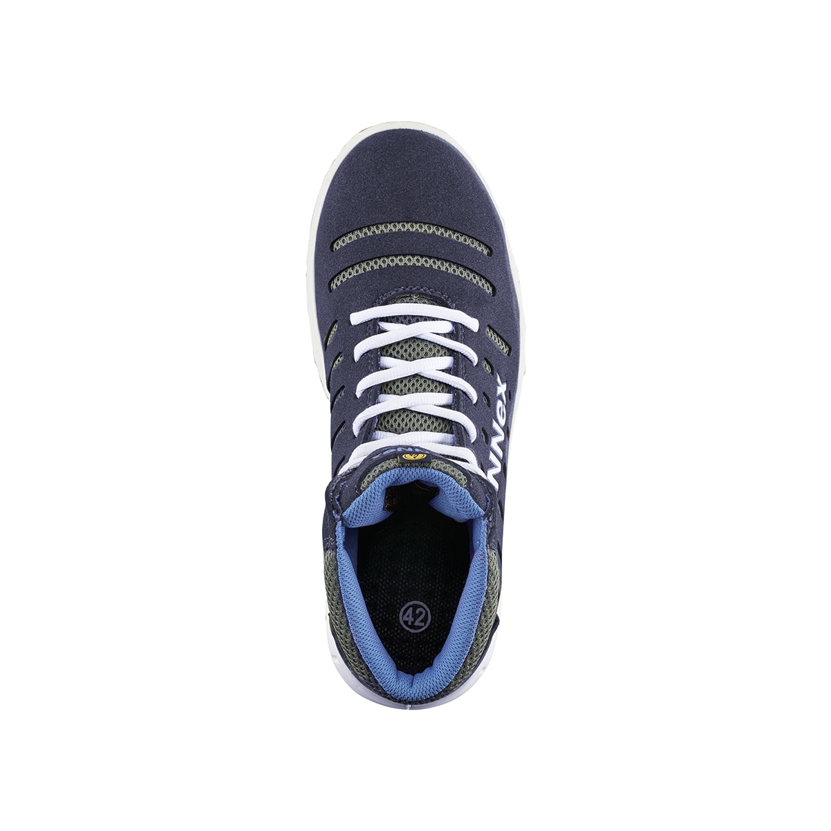 • Obermaterial: Microfasermaterial, Textileinsätze, blaue Nähte, Schnürsenkel weiß