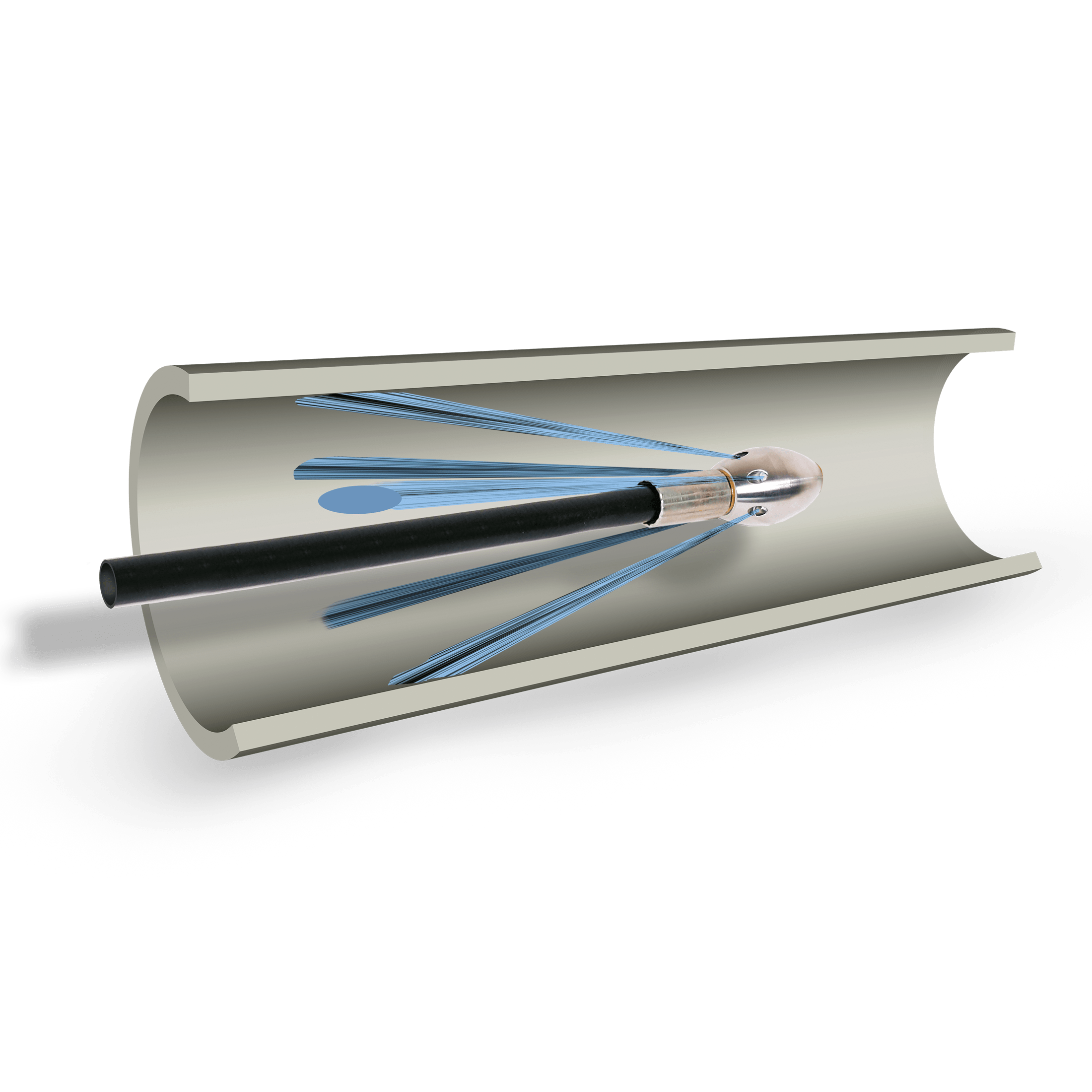 Die optimierte Anordnung des Strahlwinkels bewirkt neben der guten Reinigung auch eine hohe Zugkraft der Düsen. Dadurch sind sie auch für geringe Wassermengen bestens geeignet. Richtig eingesetzt, zentriert sich die Düse automatisch im zu reinigenden Rohr.