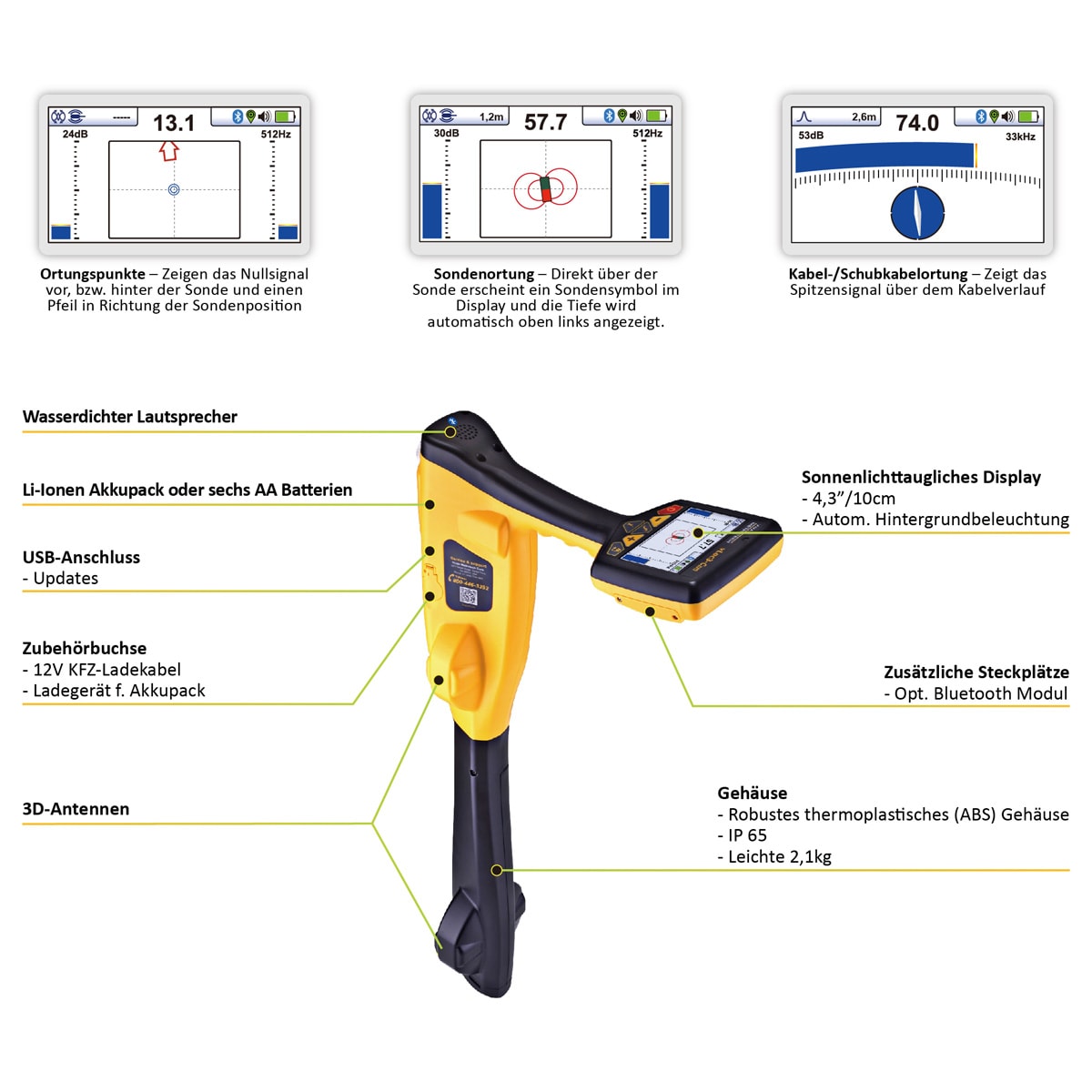 Das vLoc3-Cam ist das am einfachsten zu bedienende Sondenortungsgerät auf dem Markt. Es dient der Ortung und Tiefenmessung von Sonden, Schiebekamera- und Fahrwagensystemen, die mit Ortungssonden ausgestattet sind. Darüberhinaus verfügt das Gerät über zwei passive Ortungsmodi für Strom und Radio, zum Auffinden von stromführenden Leitungen.