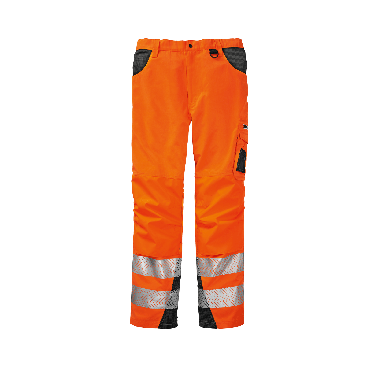 Dunkel abgesetztes Reflex-Gewebe an Innenbein, Gesäß und Tascheneingriffen. Knietaschen für Polster, sowie Taschenböden und Hosensäume aus abriebfestem Oxford-Gewebe.
