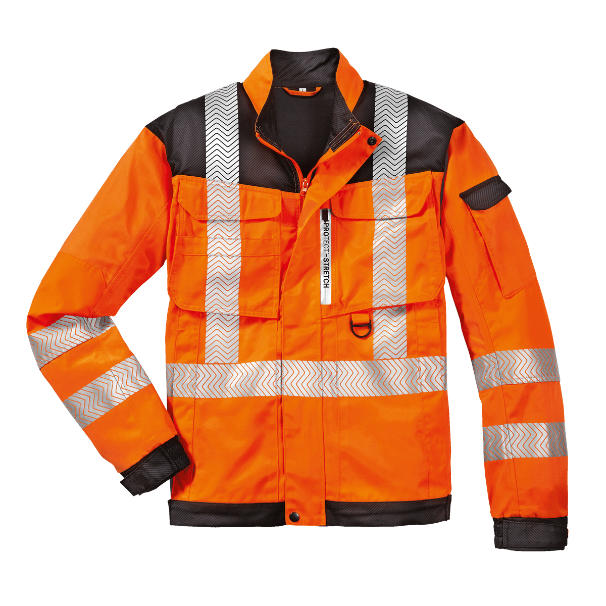 Segmentierte Reflexstreifen, die direkt aufgeprintet werden, umlaufend um Körper und Ärmel sowie über die Schulterpartien (Hosenträgerreflexstreifen). Dunkel abgesetzte Besätze an Saum, Ärmelmanschetten und im Schulterbereich verhindern leichtes Anschmutzen.