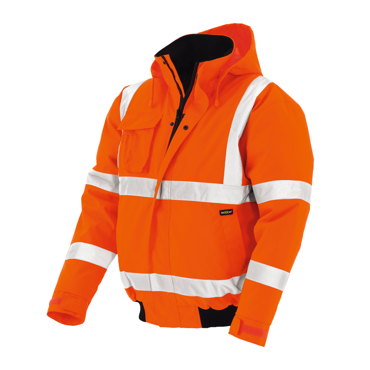 Die Pilotenjacken in Wind- und wasserdichte Ausstattung mit Reflexstreifen (ca. 5 cm breit), umlaufend um Körper und Ärmel sowie über die Schulterpartien (Hosenträgerreflexstreifen).