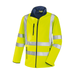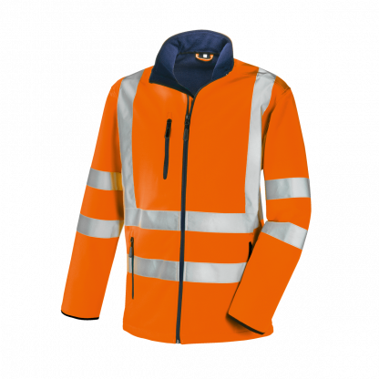Zertifizierte, hochsichtbare Warnschutz-Softshell-Jacke der Klasse 3 (nach EN ISO 20471:2013) mit umlaufenden Reflexstreifen um Körper, Ärmel sowie über die Schulterpartien (Hosenträgerreflexstreifen).