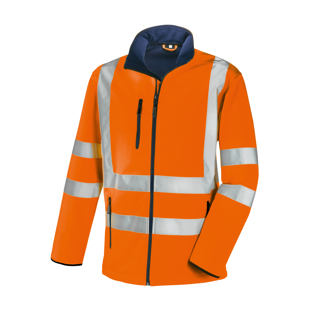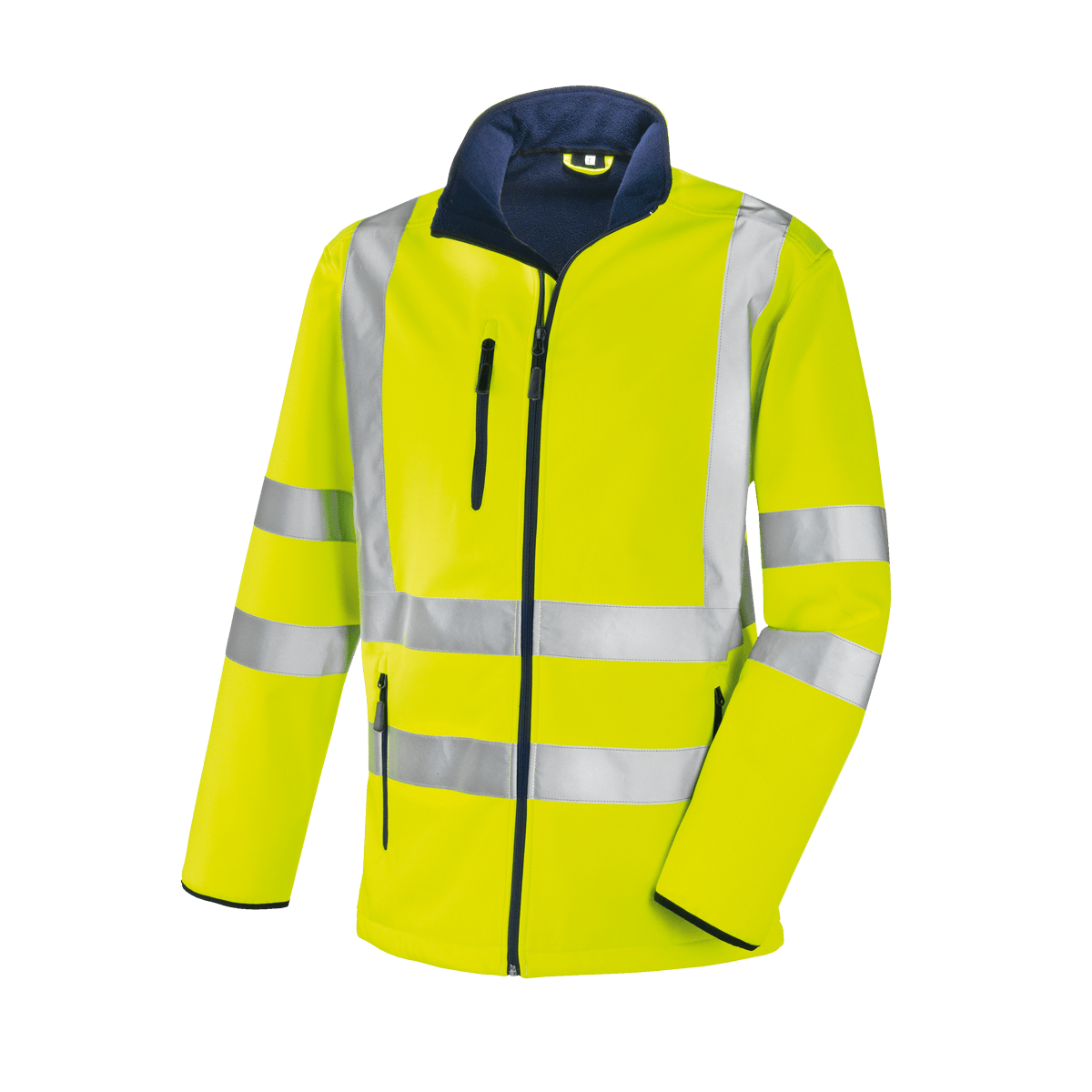 Zertifizierte, hochsichtbare Warnschutz-Softshell-Jacke der Klasse 3 (nach EN ISO 20471:2013) mit umlaufenden Reflexstreifen um Körper, Ärmel sowie über die Schulterpartien (Hosenträgerreflexstreifen).