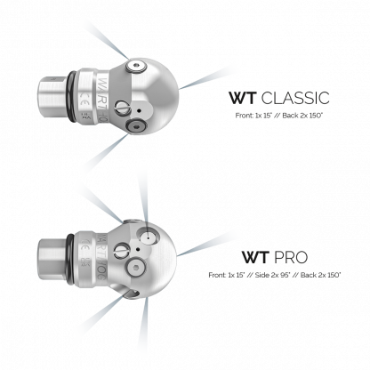 Die Warthog WT ist eine hydraulisch gebremste Rotationsdüse im Ball-Design, die sich durch ihre besondere Bogengängigkeit auszeichnet und mühelos Rohrversatz überwindet. Die WT-Düsen sind in zwei Ausführungen erhältlich: die Classic-Variante mit zwei Strahlkreisen und die Pro-Variante mit einem zusätzlichen Strahlkreis, der in einem Winkel von 95° zur Rohrwandung ausgerichtet ist, um maximale Aufprallenergie des Wassers zu erzielen. Im Gegensatz zu ungebremsten Rotationsdüsen arbeitet die WT mit einer konstanten Drehzahl, wodurch eine hohe kinetische Energie des Wassers auf die Rohrwandung übertragen wird. Die Düsen sind außerdem mit vier Hartmetall-Elementen ausgestattet, die den Düsenkörper vor Beschädigungen schützen und die Haltbarkeit erhöhen.