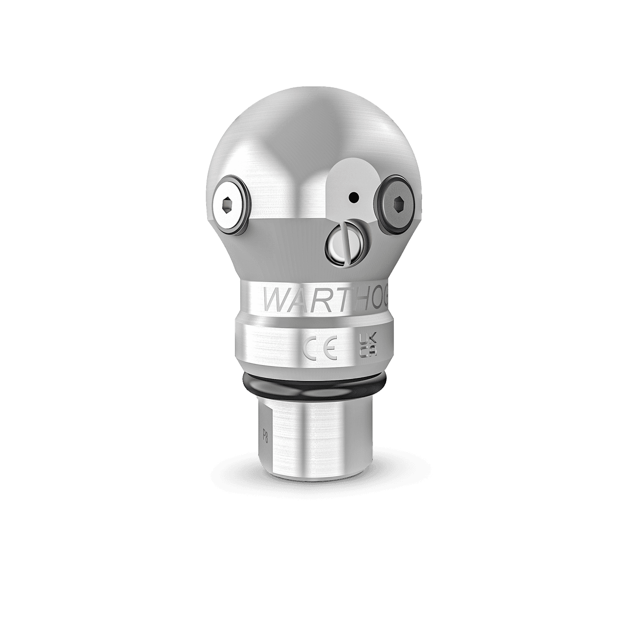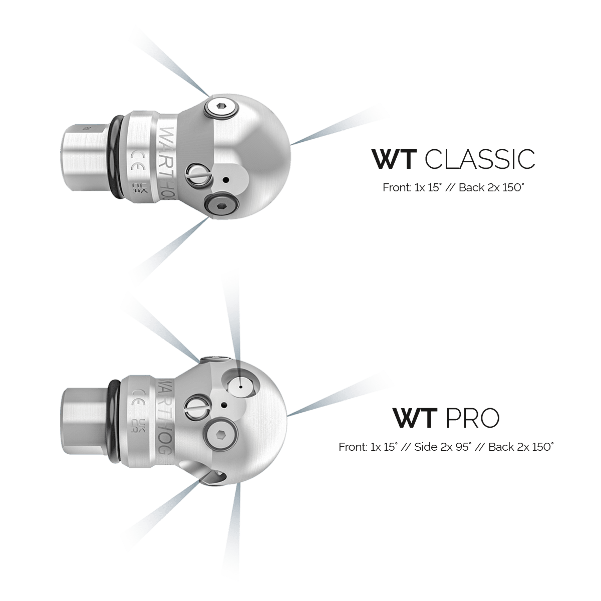 Die Warthog WT ist eine hydraulisch gebremste Rotationsdüse im Ball-Design, die sich durch ihre besondere Bogengängigkeit auszeichnet und mühelos Rohrversatz überwindet. Die WT-Düsen sind in zwei Ausführungen erhältlich: die Classic-Variante mit zwei Strahlkreisen und die Pro-Variante mit einem zusätzlichen Strahlkreis, der in einem Winkel von 95° zur Rohrwandung ausgerichtet ist, um maximale Aufprallenergie des Wassers zu erzielen. Im Gegensatz zu ungebremsten Rotationsdüsen arbeitet die WT mit einer konstanten Drehzahl, wodurch eine hohe kinetische Energie des Wassers auf die Rohrwandung übertragen wird. Die Düsen sind außerdem mit vier Hartmetall-Elementen ausgestattet, die den Düsenkörper vor Beschädigungen schützen und die Haltbarkeit erhöhen.